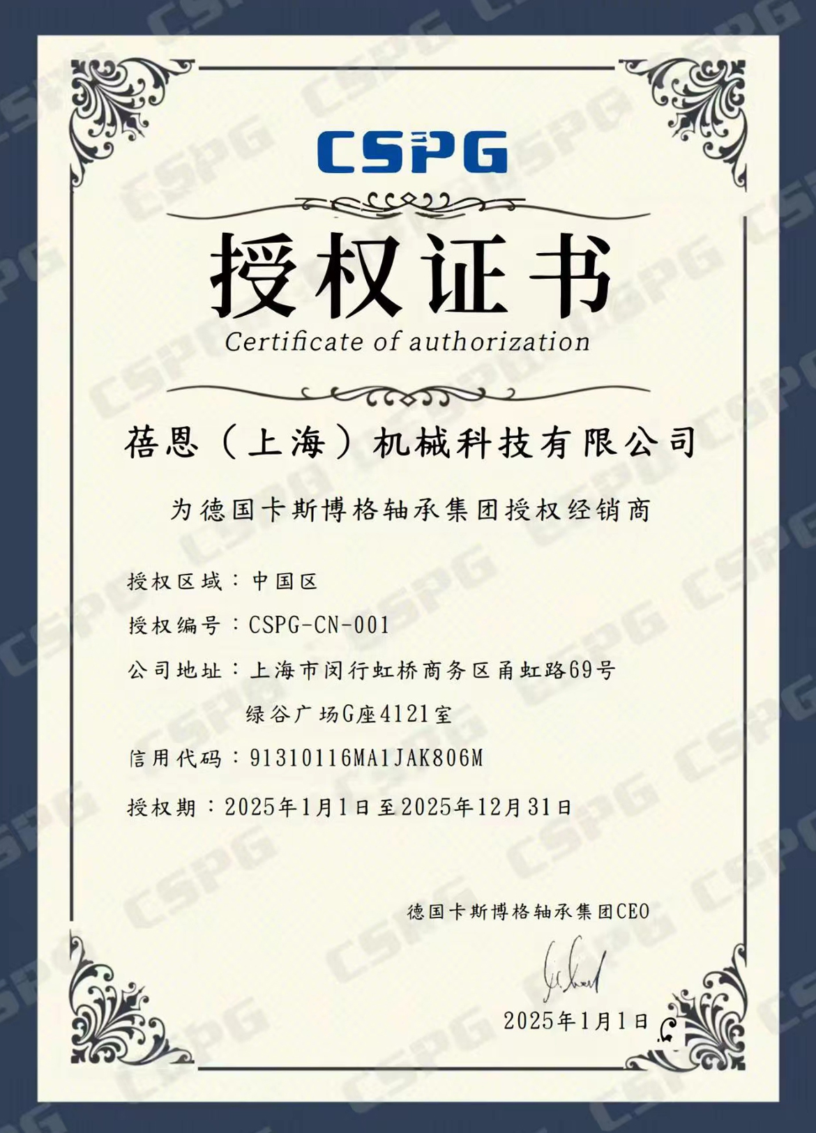 蓓恩機械2025年繼續(xù)獲得CSPG(精密主軸軸承/高速電主軸)授權